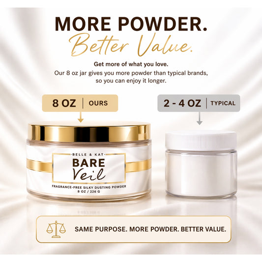 Our 8oz body powders are nearly double the size of most handcrafted and boutique brands - giving you more product, longer use, and better value with every jar.